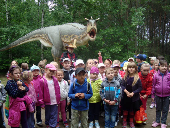 Każdego roku w czerwcu grupy sześciolatków planują sobie ostatnią dłuższą wspólną wycieczkę. Tym razem dzieci wybrały się do Parku Jurajskiego położonego w Jurowcach nieopodal Białegostoku. Park ten to idealny cel na taką właśnie wycieczkę. Dzieci od małego fascynują się przecież prehistorią, a zwłaszcza dinozaurami. Prawie bezbłędnie potrafią wymienić nazwy swoich ulubionych, z którymi miałby problem niejeden dorosły. Największą atrakcją Parku Dinozaurów okazały się oczywiście naturalnej wielkości modele prehistorycznych gadów. Przesympatyczny przewodnik oprowadzał wycieczkowiczów przez kolejne okresy geologiczne, pokazując jak rozwijało się życie na ziemi. Podczas spaceru jakby czas się zatrzymał setki milionów lat temu i dzieci stanęły oko w oko z dinozaurami - największymi zwierzętami, jakie kiedykolwiek żyły na ziemi. Nie obyło się także bez ogniska i pieczenia pysznych kiełbasek. Na koniec dzieci skorzystały z innych proponowanych w tym miejscu atrakcji. Między innymi wszyscy, włącznie z paniami, szczęśliwie pokonali powietrzny tor przeszkód. Wycieczka w prehistorię była niezapomnianym przeżyciem i dostarczyła dzieciom dużo wrażeń. Miło spędziły czas i na pewno wiele się nauczyły i dowiedziały. Szczęśliwe i uśmiechnięte wracały do przedszkola ściskając w dłoniach pamiątki – figurki dinozaurów. |