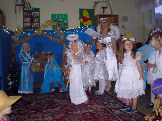Nie ma nic urokliwszego niż Jasełka w wykonaniu dzieci. Wzruszające jest to jak mali pastuszkowie, królowie spieszą do szopki, aby pokłonić się dzieciątku. Dzieci, ich rodzice i nauczycielki każdego roku bardzo angażują się w przygotowanie przedstawienia. W Jasełkach zobaczyliśmy miedzy innymi Józefa i Maryję, trzech króli, pastuszków oraz aniołki i diabełka. Mali artyści wraz z zaproszonymi gośćmi zawsze śpiewają przy symbolicznym żłóbku piękne kolędy. |