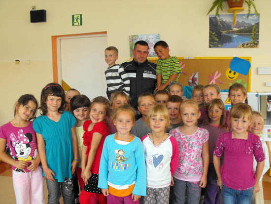 Do naszego przedszkola z wielką ochotą przybywają osoby pełniące ważne i odpowiedzialne funkcje społeczne, aby spotkać się i porozmawiać z dziećmi o swojej pracy. Jednym z takich miłych gości, oczekiwanym z wielką niecierpliwością przez pięcio i sześciolatki był funkcjonariusz Komendy Powiatowej Policji w Ełku, a dokładnie z Wydziału Ruchu Drogowego. Spotkanie z przedszkolakami przebiegało w bardzo miłej atmosferze. Głównym tematem było bezpieczeństwo dzieci na drogach, w przedszkolu oraz na placu zabaw. Pan Policjant bardzo dokładnie wyjaśniał, jak należy zachowywać się i poruszać po ulicach. Ochotnicy zademonstrowali gościowi, jak należy prawidłowo i bezpieczne przechodzić po pasach przez jezdnię. Żaden z przedszkolaków nie miał również problemu z wyjaśnieniem, jak należy prawidłowo korzystać z sygnalizacji świetlnej. Funkcjonariusz przypomniał jak ważne jest to, aby każde dziecko jeździło w foteliku samochodowym. Celem spotkania było również zapoznanie dzieci z zawodem policjanta, a także z umundurowaniem i rekwizytami. Pan policjant podkreślał i przekonywał dzieci, iż policja jest po to, aby ich chronić i pomagać wszystkim ludziom. Dzieci wyróżniały i wskazywały znane znaki drogowe: ostrzegawcze, zakazu, nakazu i informacyjne. Zwróciły uwagę na ich kształty i kolory. W czasie spotkania pan policjant podkreślił jak bardzo odpowiedzialna i niebezpieczna jest praca policjanta oraz przypomniał przedszkolakom zasady ruchu drogowego. Dzieci miały możliwość zadawania pytań. Wszystkie dzieci wiedziały, że przechodząc przez ulicę nie należy biec ani też spacerować, a należy zrobić to szybkim i zdecydowanym krokiem. Oczywiście w asyście osób dorosłych. Jak zwykle szczególnym zainteresowaniem wśród dzieci cieszyła się prezentacja sprzętu policyjnego Ogromny zachwyt na ich twarzach wywołał zwłaszcza policyjny motocykl i jego wyposażenie. |