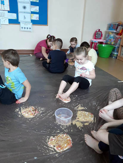 Realizując temat kompleksowy „W laboratorium zmysłów” dzieci miały okazję uczestniczyć w warsztatach sensorycznych zorganizowanych przez Salę Zabaw Tropico. Podczas zajęć przedszkolaki mogły doświadczać świat wszystkimi zmysłami. Dzielnie wykonywały wszystkie polecenie przy tym świetnie się bawiąc. Ugniatały ciasto z kaszy łącząc różne składniki. Dekorowały ulepiony w grupie placek (Pizza), pięknie współpracując ze sobą. Układały ścieżkę sensoryczną po której chodziły bosymi stopami. Zabawa była wyśmienita. |