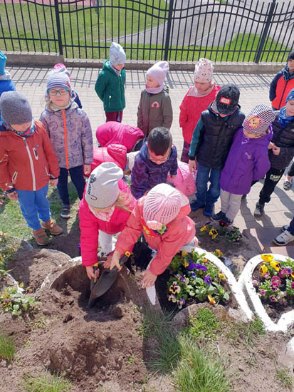 Podczas cyklu zajęć ekologicznych związanych z obchodami Dnia Ziemi przedszkolaki z grupy 5-latki 1 wraz z paniami wyszły z inicjatywą upiększenia wejścia do budynku szkolnego. Zaprosiliśmy do współpracy pozostałe grupy 5-latków wraz z rodzicami. Dzieci z pomocą nauczycieli posadziły wiosenne kwiaty. Zobowiązały się także do codziennej pielęgnacji roślin – podlewania i doglądania. Pomysł sadzenia kwiatów bardzo spodobał się dzieciom, które z uśmiechem na twarzach oraz dużym zaangażowaniem sadziły swoją roślinkę. Serdecznie dziękujemy wszystkim rodzicom którzy włączyli się w tą piękną, wiosenną inicjatywę. |
