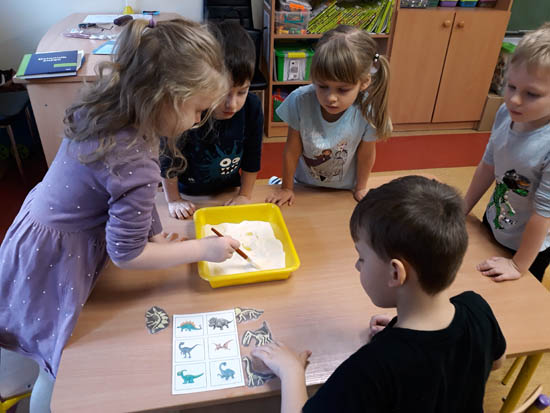 25 lutego „Śliweczki” obchodziły Dzień Dinozaura. Prehistoryczne gady to ulubiony temat wszystkich niemal dzieci, a zwłaszcza chłopców. Nie ma co się dziwić. Niektóre swoim wyglądem przypominają przecież smoki z bajek. Nie zionęły co prawda ogniem, ale czy aby na pewno? Dzieci jednego były pewne, nie porywały żadnych księżniczek, bo tych po prostu wtedy nie było. W naszej grupie Dawid okazał się prawdziwym ekspertem i wykazał się dużą znajomością tych wymarłych przed latami stworów. Potrafił nie tylko podać ich nazwy, ale wiedział również, w jaki sposób rozmnażały się i odżywiały. Chętne pomagał rówieśnikom segregować je na mięso i roślinożerne. Dzieci bawiły się w paleontologów i przy pomocy pędzelków ostrożnie odkrywały szkielety dinozaurów ukryte w piasku. Dopasowywały je potem do odpowiedniego zwierza na obrazku. Dzień Dinozaura był świetną okazją do rozwijania dziecięcych kompetencji matematycznych. Pięciolatki przeliczały „jaja” dawnych gadów, klasyfikowały je ze względu na wielkość, porównywały liczebność powstałych zbiorów, wskazywały gdzie jest więcej, mniej lub tyle samo oraz układały od najmniejszego do największego. Nie obeszło się bez zadań związanych z kodowaniem. Dzieci podzielone na zespoły wspólnymi siłami zapisywały przy pomocy kwadratów ze strzałkami drogę dinozaura do pożywienia lub gniazda. „Śliweczki” nie raz już wykonywały takie zadania, więc i tym razem nie miały z tym żadnego kłopotu. Najwięcej radości sprawiły przedszkolakom ćwiczenia ruchowe, czyli pokonanie toru przeszkód, nazwanego przez nie „drogą do gniazda z jajami”. W takim dniu nie mogło zabraknąć wesołej piosenki, podczas której trzeba było wykazać się umiejętnością naśladowania sposobu poruszania się różnych dinozaurów: latających, ciężko kroczących, szybko biegających. Duże emocje towarzyszyły pięciolatkom podczas oglądania obrazków przedstawiających dinozaury w 3D przez specjalne okulary. Na koniec każdy wykonał z papieru i ulepił z plasteliny własne dinozaury, które z dumą zabrał do domu do zaprezentowania rodzinie. |