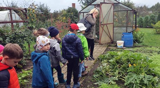 Grupy 4-latki 1 „Wiewiórki” oraz 6-latki 3 „Zajączki” uczestniczyły w wycieczce do Rodzinnych Ogródków Działkowych „Jarzynka” w Ełku. Celem wycieczki było zobaczenie ogródków działkowych w jesiennych barwach, zapoznanie dzieci z ekologiczną uprawą roślin oraz pracami ogrodniczymi wykonywanymi jesienią. Przedszkolaki rozpoznawały znane im drzewa (jabłonie, grusze, śliwy), krzewy owocowe (maliny, jeżyny), warzywa (marchew, buraki, ziemniaki, dynie, pietruszki, seler) oraz kwiaty (chryzantemy, wrzosy, miechunki, astry). Dzieci mogły wejść na zaznajomione działki i z bliska obserwować jesienną roślinność. Na koniec nadszedł czas na swobodną zabawę w pięknym otoczeniu przyrody. |