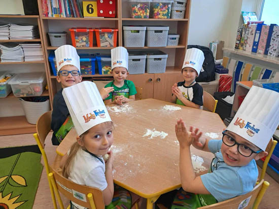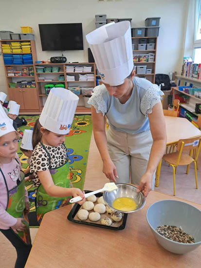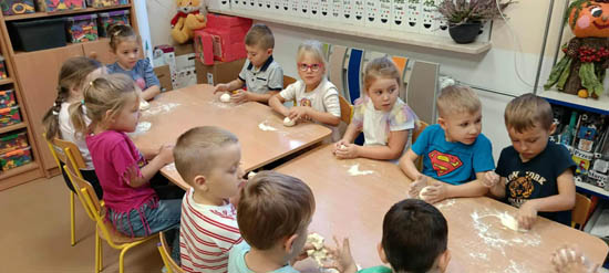 Dnia 16 października grupy 6 latki 1 „Jagódki” i 5 latki 3 „Liski” zorganizowały warsztaty kulinarne w ramach Światowego Dnia Chleba, jednocześnie realizując innowację pedagogiczną pt: „Kulinarna przygoda w Ekoludkach”. Grupa „Jagódki” zapoznała się z pracą robota kuchennego Thermomix, po czym zmieniła się w małych kucharzy i rozpoczęła pieczenie bułeczek pszennych z ziarnami : słonecznika, dyni i lnu. Grupa „Liski” z historyjki obrazkowej poznała etapy pieczenia chleba, a następnie dzieci zaczęły samodzielne zagniatanie ciasta i formowanie małych chlebków. Po upieczeniu dzieci przystąpiły do degustacji pieczywa. |